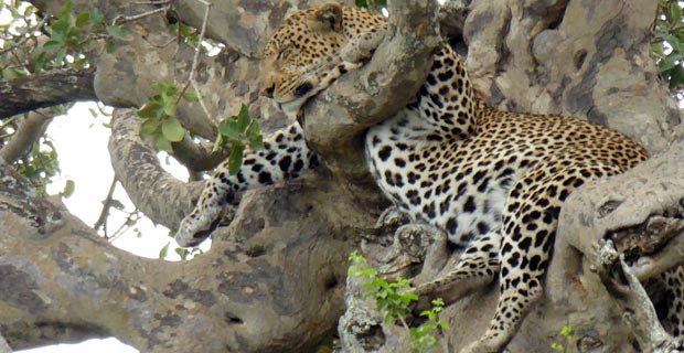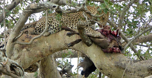 In der Serengeti haben wir einen Leoparden beim Mittagessen beobachtet: Mitsamt seiner Beute saß er im Baum und hatte das Gnu über einen Ast gehängt.