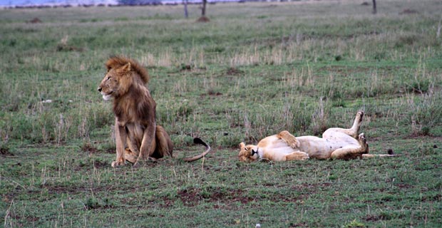 Ein andermal haben wir ein Löwenpärchen beobachtet: Er lag ganz schläfrig in der Sonne, neben ihm das Weibchen. Wir wollten eigentlich weiterfahren, aber unser Guide meinte, wir sollten noch ein paar Minuten warten. Plötzlich stand das Männchen auf und die beiden paarten sich! Ruckzuck, innerhalb von zehn Sekunden war es auch schon wieder vorbei und das Weibchen rollte sich auf den Rücken. Es ist schon sehr wertvoll einen Guide zu haben, der sich auskennt, sonst hätten wir dieses Erlebnis bestimmt verpasst.