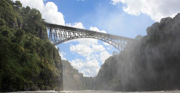 Der Weg ist nicht immer eben, teilweise müssen Sie über Stock und Stein krackseln und durch die Gischt ist es rutschig, doch es lohnt sich: Unten angekommen eröffnet sich eine ganz neue Sicht auf die Victoria Falls Bridge über dem Sambesi.