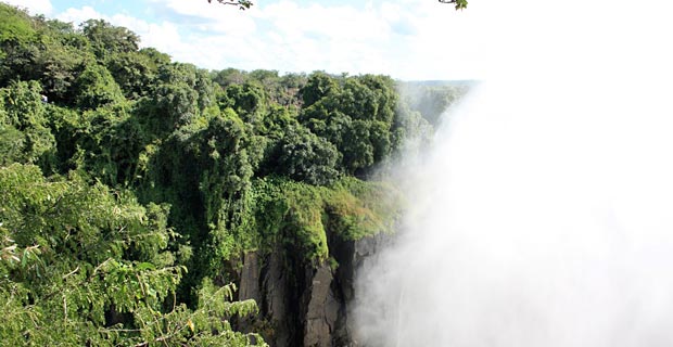 Zwischen März und April laufen die Vic Falls wortwörtlich zu Höchstform auf: Bis zu 10.000 Kubikmeter Wasser pro Sekunde donnern mehr als hundert Meter in die Tiefe. Die Gischt gibt den Fällen selbst und dem sie umschließenden Nationalpark ihren Namen: Mosi-Oa-Tunya, der donnernde Rauch.