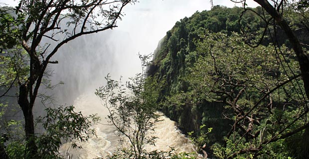 Über einen steilen und steinigen Pfad geht es hinab zum „Boiling Point“, dorthin, wo sich die Wassermassen nach ihrem tosenden Sturz hinab der Fälle sammeln und zu reißenden Strudeln werden, bevor sie den Sambesi hinunterrauschen.