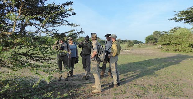 Wir stehen sehr früh auf für das zweite Highlight, eine Fußwanderung durch den Busch. Noch vor Sonnenaufgang werden wir mit dem Auto in den Busch gefahren, von dort laufen wir mit unserem Guide und einem bewaffneten Ranger zurück zum Camp. In einem hohlen Baumstamm finden wir gar eine neugeborene Hyäne, dessen Mutter uns bestimmt aus einem nahegelegenen Busch beobachtet. Natürlich regen wir Mutter und Kind nicht über Gebühr auf, nur einer von uns krabbelt kurz in die Höhle für ein Foto.