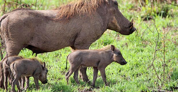 Viele der Warzenschweine haben putzigen Nachwuchs, der wieselflink rennen kann; auch ganz ganz kleine Giraffen von höchsten zweieinhalb Metern Höhe sehen wir oft.