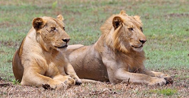 Die Savanne erinnert an vielen Stellen an die Serengeti. Sogar die ersten Löwen beobachten wir; eine Löwin mit einem jungen aber selbstbewussten Männchen sowie eine ältere Löwin, die etwas Abseits liegt und eine Verletzung am Rücken hat.