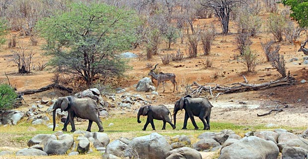 In diesem Jahr ist an diesem Flussabschnitt weniger los ist und die meisten Tiere halten sich in Mwagusi, jenseits des weithin sichtbaren Felsenberges namens Kimilamatonga Hill, auf. Bis dorthin ist es fast eine Stunde Fahrtzeit durch vertrocknetes Buschland, entsprechend stellen wir die Tageszeiten für unsere Pirschfahrten darauf ein. Am Fluss entlang gibt es mehrere Stellen mit spektakulären Aussichten über das Buschland. Deshalb beschäftigen wir uns diesmal etwas ausgiebiger mit Landschaftsfotografie.
