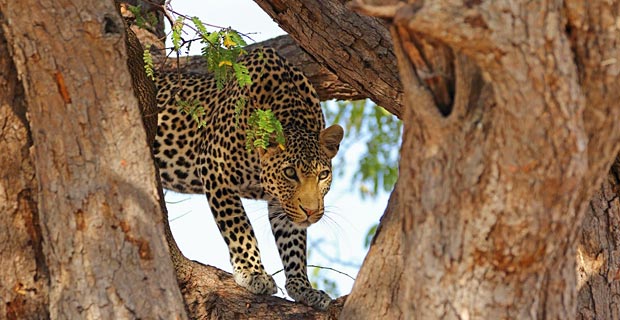 Und dann klappt es doch noch mit dem Leoparden im Baum! Zuerst bleibt die schöne Katze eine Weile schläfrig in ihrer Astgabel liegen, plötzlich richtet sie sich auf, streckt sich und schickt sich an, vom Baum herunterzukommen. Doch dann gähnt sie nochmals und wechselt nur in eine Astgabel weiter im Baum, die nicht einsehbar ist. Das war aufregend und hat uns ein paar tolle Bilder beschert.
