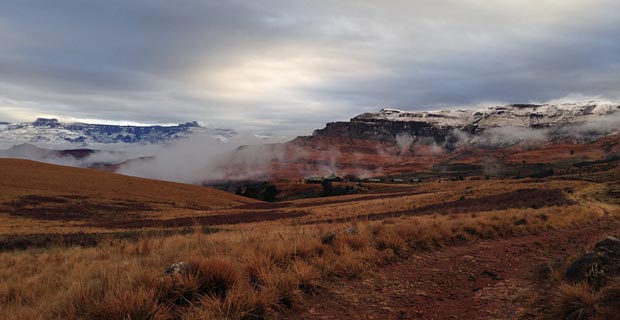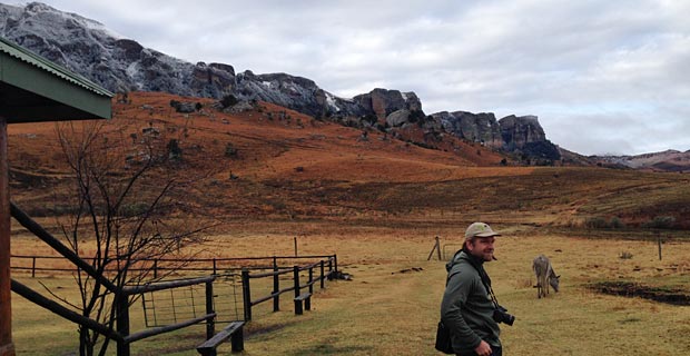 An die Drakensberge. Ich kam im August aus dem deutschen Sommer in den südafrikanischen Winter. Angekommen in den Drakensbergen hatte es geschneit! Die rote Erde, die gelbe Steppe, der dann blaue Himmel und die mit Schnee bedeckten Berge, dazu die atemberaubende Aussicht – unglaublich.